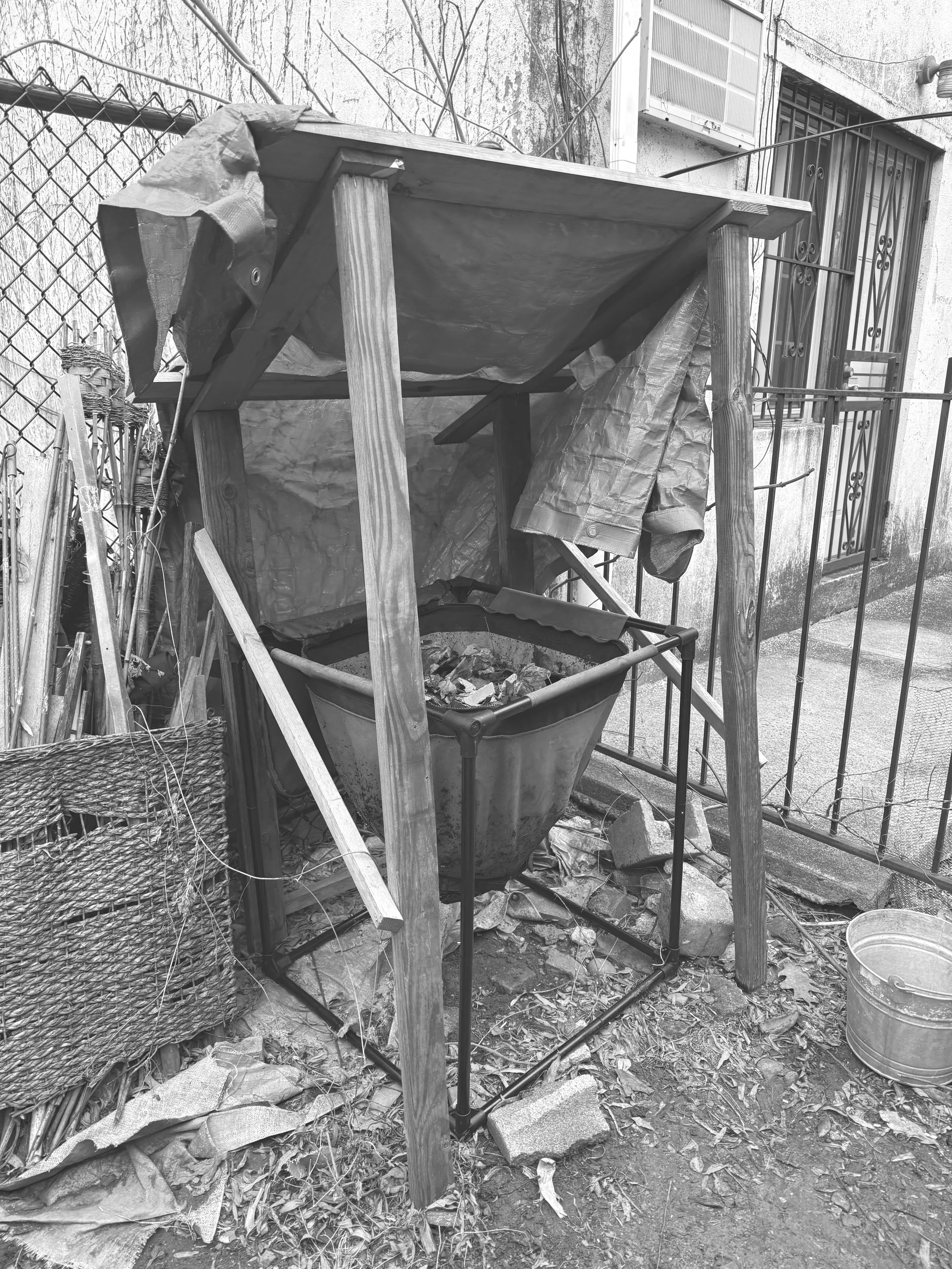 The vermibin, or worm bin, looks a bit like a very large coffee filter. (It doesn’t smell like coffee, let’s just say that. And if you know me, I’m kind of a coffee expert.) Cone-shaped, opens from the top, very chic if you’re into that sort of thing. It sits in a metal frame that, until recently, had rusted and taken a true beating from the elements.